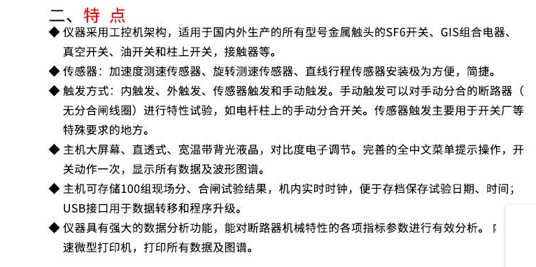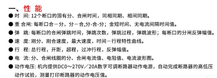| l HTGKC-12F高壓開關(guān)測試儀適用于國內(nèi)外生產(chǎn)的所有型號的SF6開關(guān)、GIS組合電器、真空開關(guān)、油開關(guān)的機械特性試驗。 l 超強的抗干擾能力,在500KV變電站旁路母線帶電的情況下,也能輕松試驗,精確測量。 l 通用式測速傳感器,直線傳感器,旋轉(zhuǎn)傳感器,安裝極為方便、簡捷。 l 開關(guān)動作一次,得到開關(guān)機械特性試驗所有數(shù)據(jù)及相應(yīng)的波形圖譜。 l 主機可存儲現(xiàn)場試驗數(shù)據(jù),機內(nèi)實時時鐘,便于存檔保存試驗日期、時間。 l 主機大屏幕、寬溫度、直透視、背景光液晶、全中文顯示所有數(shù)據(jù)及圖譜,液晶對比度電子調(diào)節(jié)、斷電記憶。 l 中文菜單操作,使用方便。儀器內(nèi)置打印機,隨時快速打印所有數(shù)據(jù)及圖譜。 開關(guān)測試儀技術(shù)參數(shù) 1、使用環(huán)境 溫 度: -10~40℃ 濕 度: ≦80%RH 2、安全性能 絕緣電阻: >2MΩ 介電強度: 電源對機殼工頻1.5KV耐壓1分鐘,無閃絡(luò)與飛弧。 3、基本參數(shù) (1)時 間:量程 4000.0ms 分辯率0.1ms